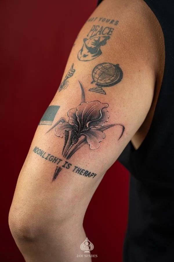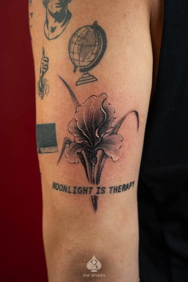 The Iris Flower Tattoo Cover-Up is where elegance meets transformation. At 3 Of Spades Tattoo Hanoi, we specialize in turning old, unwanted tattoos into refined floral compositions that feel intentional and timeless. With its flowing structure and layered petals, the iris is one of the most effective designs for cover-up work—soft in appearance, yet powerful in execution. As we say: Body is my journal, tattoos are my stories.