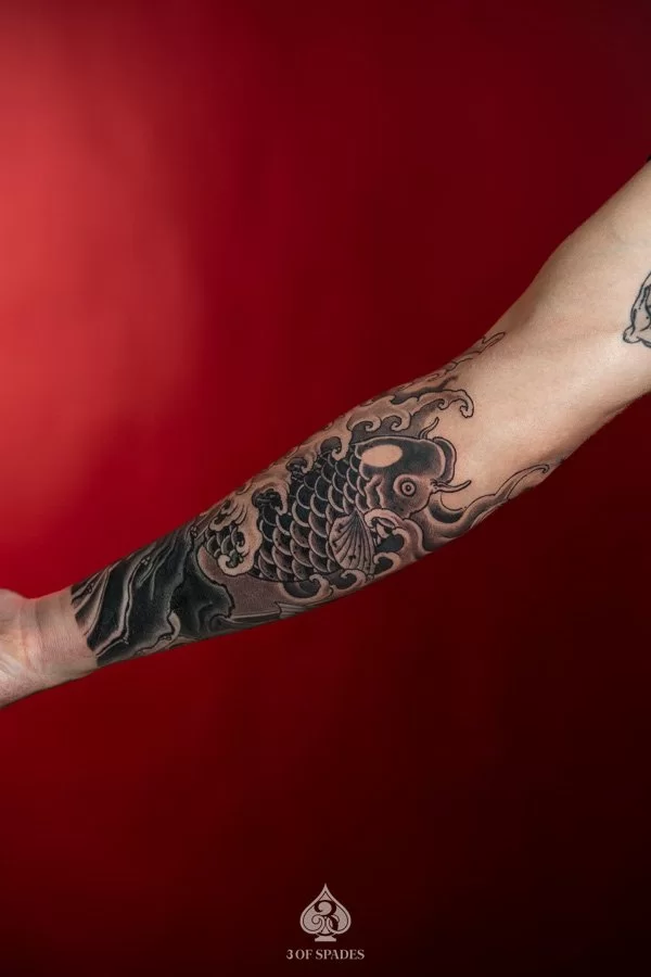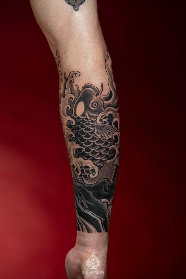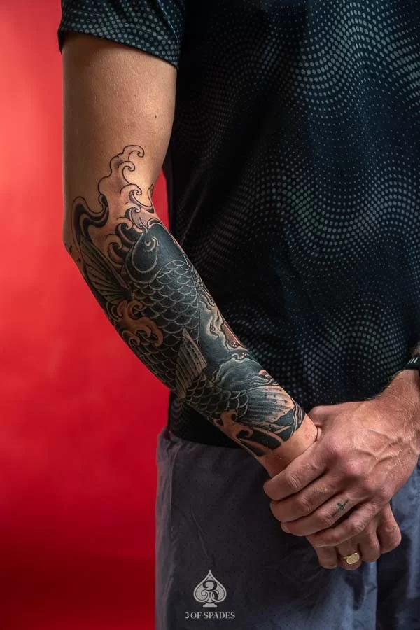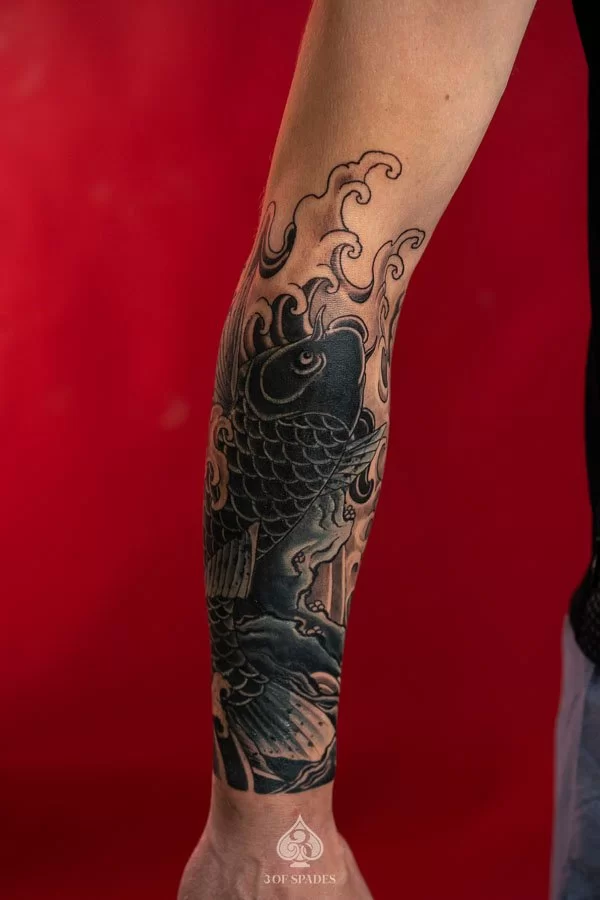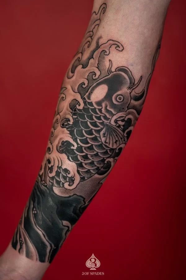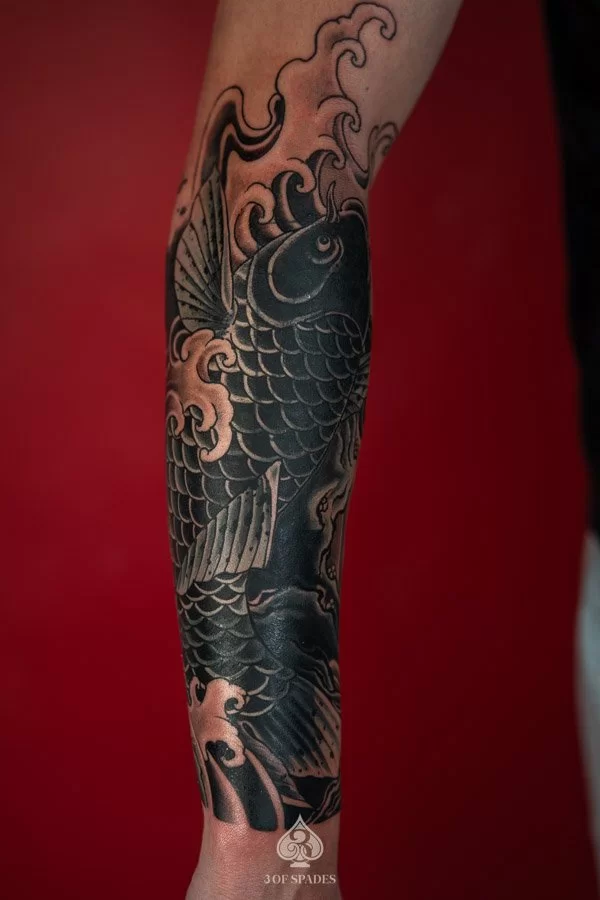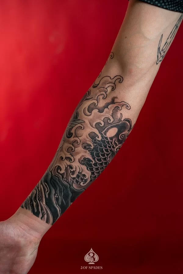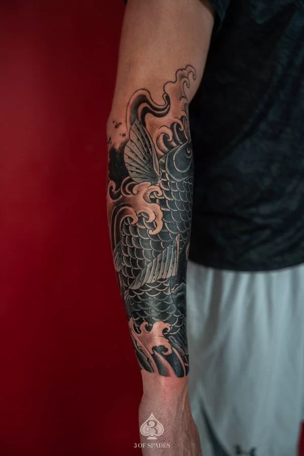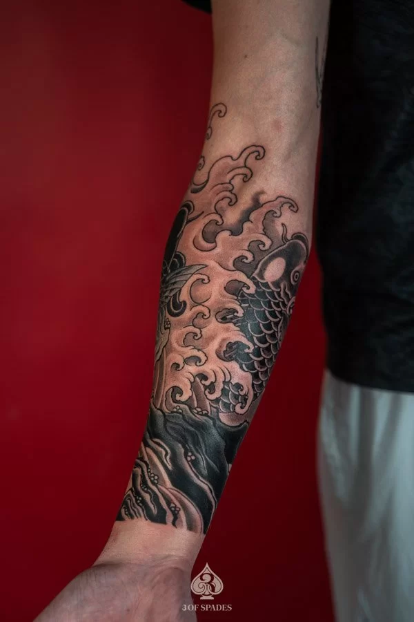 This piece features a black and grey koi fish with traditional Japanese-inspired waves, designed strategically for full coverage: