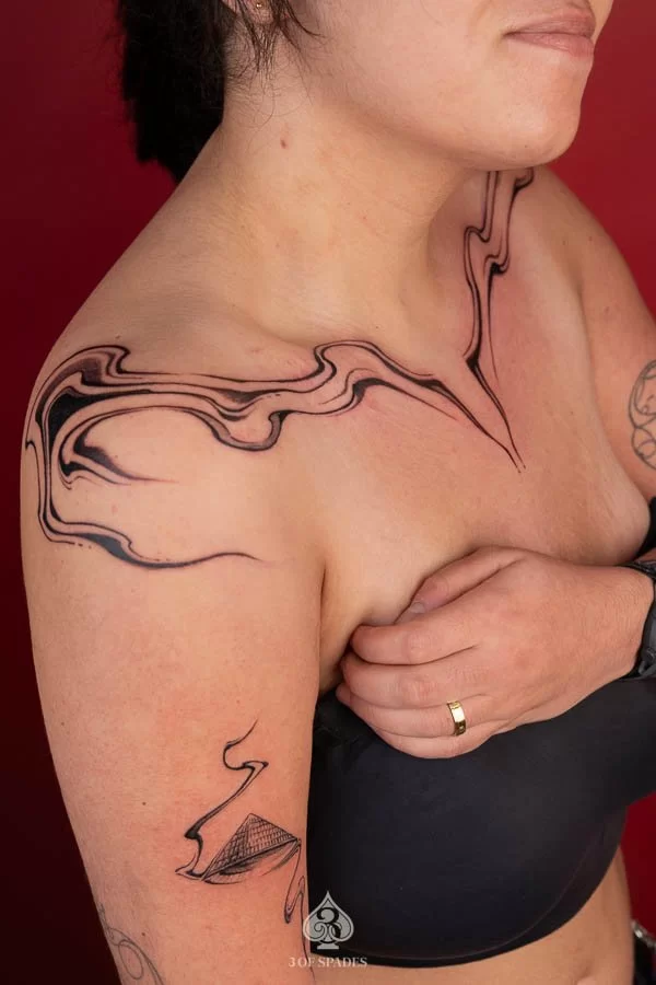 This interpretation brings a painterly quality to the Abstract Flow Conical Tattoo, blending artistic technique with tattoo craft. It creates a unique piece that feels both spontaneous and carefully considered.