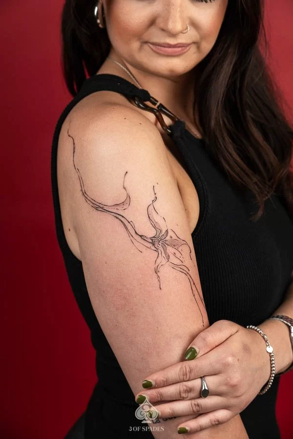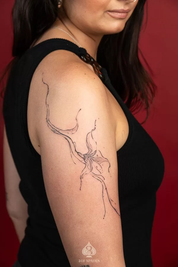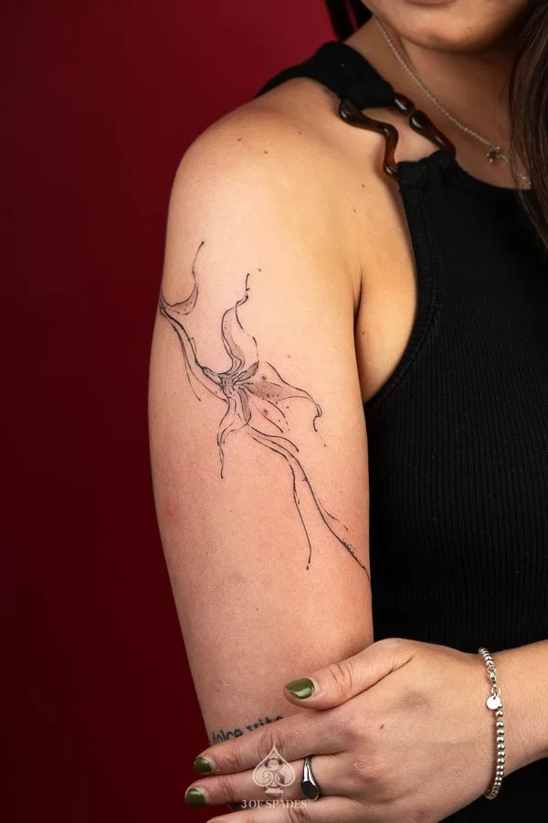 This interpretation brings a painterly quality to the Abstract Flower 5 Tattoo, blending artistic technique with tattoo craft. It creates a unique piece that feels both spontaneous and carefully considered.