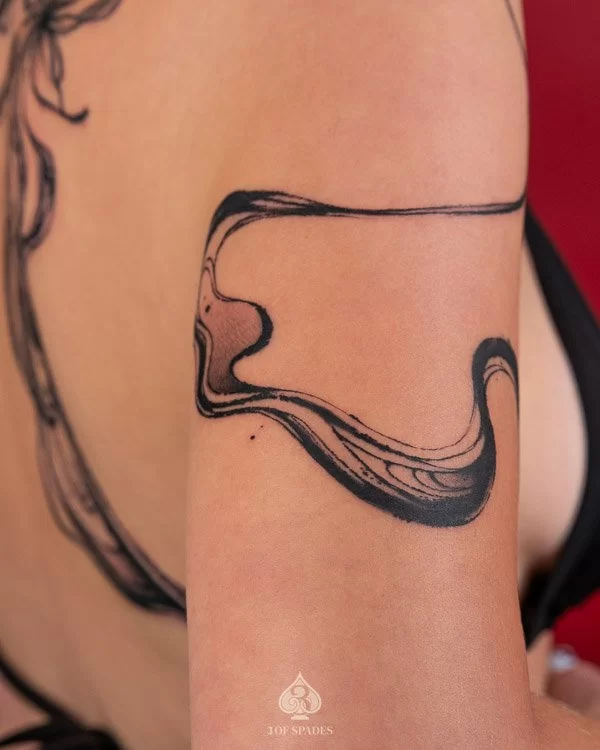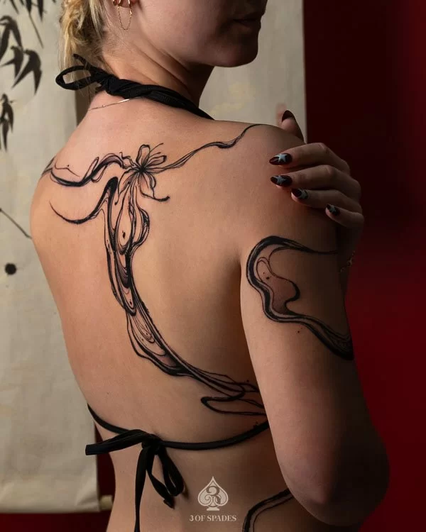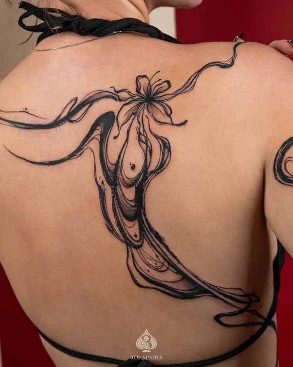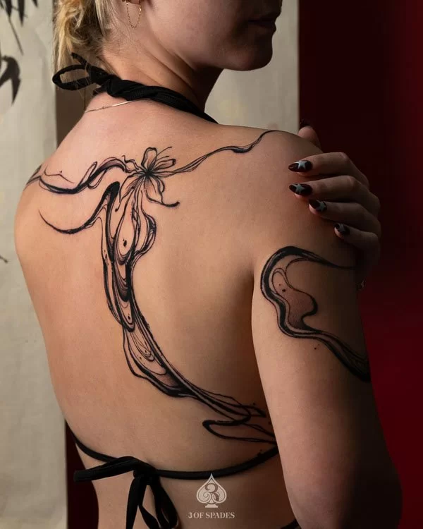 This interpretation brings a painterly quality to the Abstract Flower Flow 1 Tattoo, blending artistic technique with tattoo craft. It creates a unique piece that feels both spontaneous and carefully considered.
