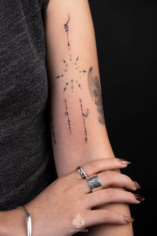 A Asemic Add Up tattoo represents a powerful connection between inner emotion and outward expression. The specific meaning can vary based on the design elements, style, and personal intention of the wearer. Our artists at 3 Of Spades Tattoo Hanoi can help you incorporate meaningful details into your unique design.