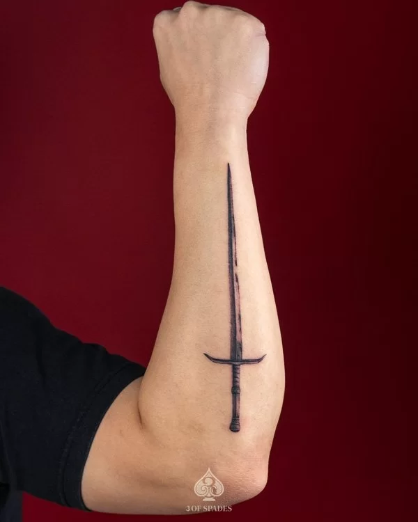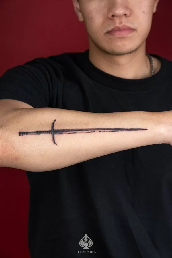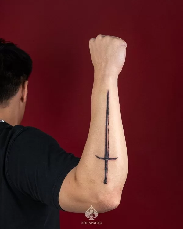 This interpretation brings a painterly quality to the Blackwork Sword Tattoo, blending artistic technique with tattoo craft. It creates a unique piece that feels both spontaneous and carefully considered.