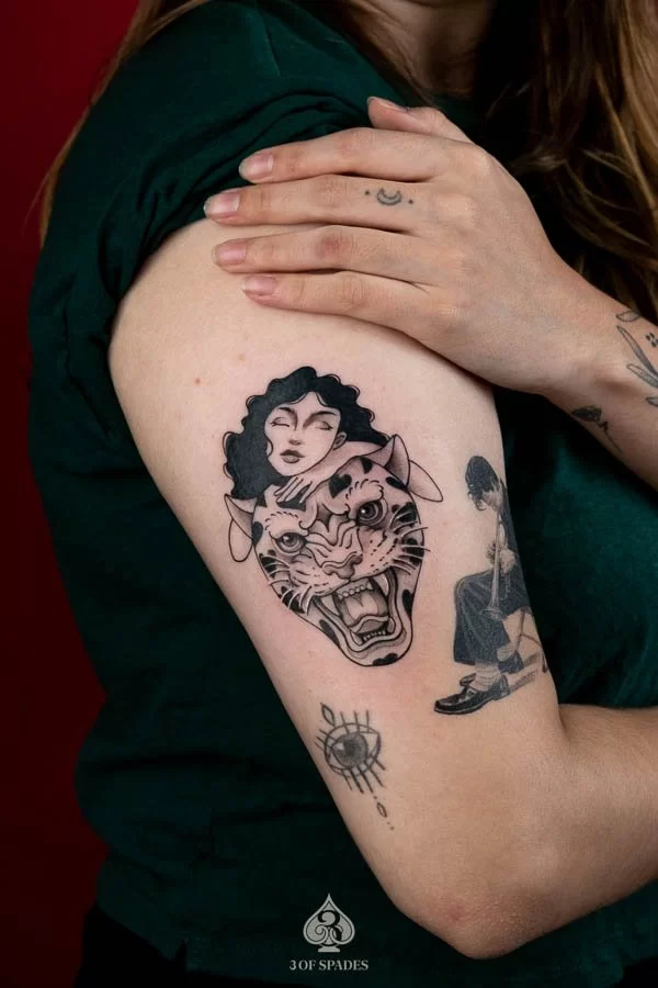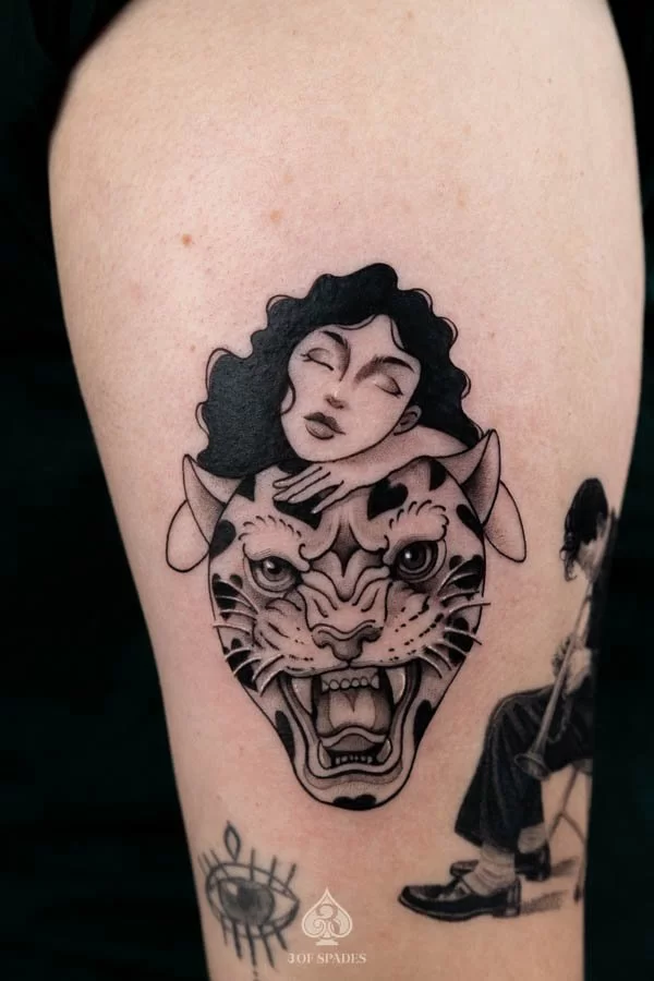 Combining different artistic influences, this approach to the Tiger Woman Blakcwork Tattoo creates something truly one-of-a-kind. It bridges traditional tattoo aesthetics with contemporary design sensibilities for a result that feels fresh and timeless.