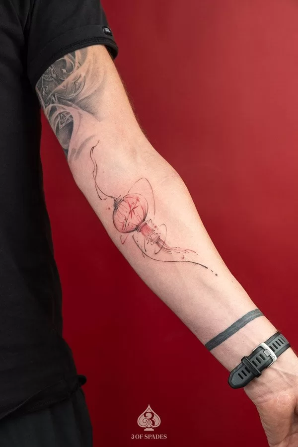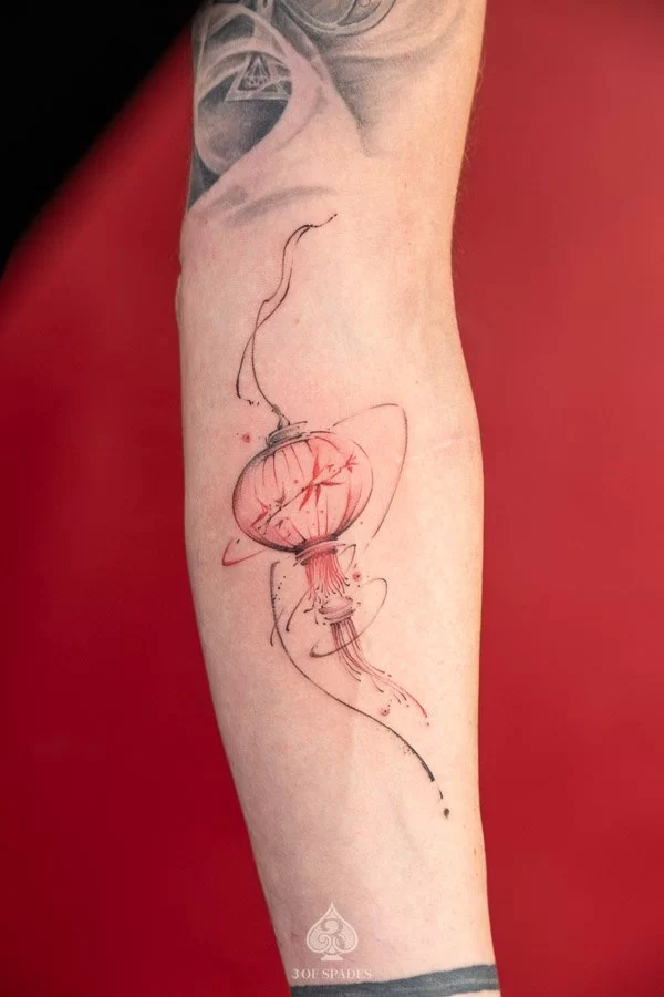 This interpretation brings a painterly quality to the Brushstroke Lantern 2 Tattoo, blending artistic technique with tattoo craft. It creates a unique piece that feels both spontaneous and carefully considered.