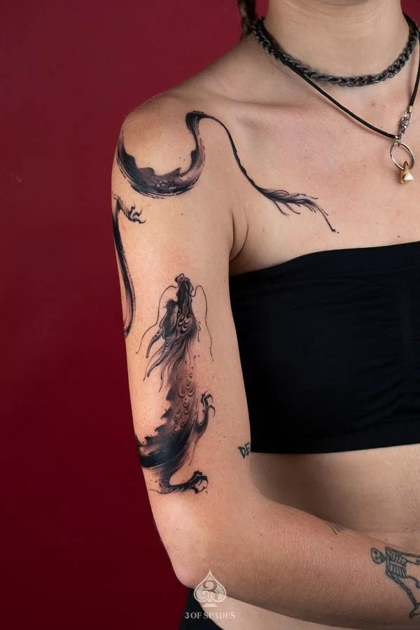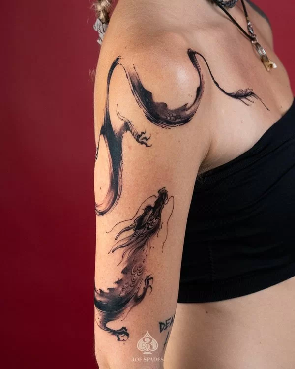 A Dragon Brush Shoulder Hand tattoo holds cultural and spiritual meaning that transcends simple aesthetics. The specific meaning can vary based on the design elements, style, and personal intention of the wearer. Our artists at 3 Of Spades Tattoo Hanoi can help you incorporate meaningful details into your unique design.