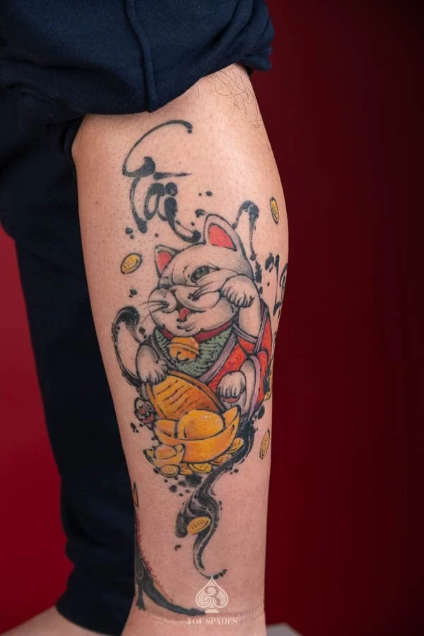 A Maneki Neko Japnaese Brushstroke tattoo carries deep personal significance for many who choose it. The specific meaning can vary based on the design elements, style, and personal intention of the wearer. Our artists at 3 Of Spades Tattoo Hanoi can help you incorporate meaningful details into your unique design.