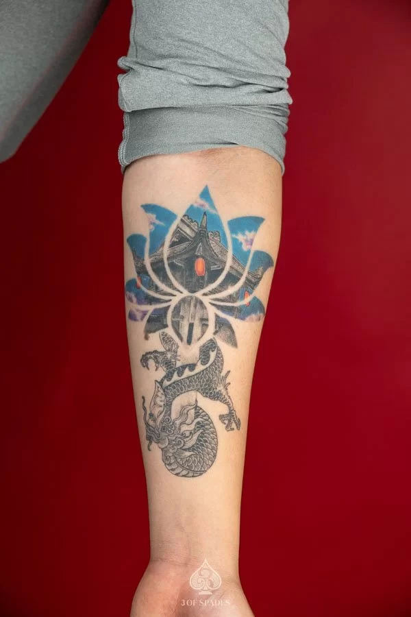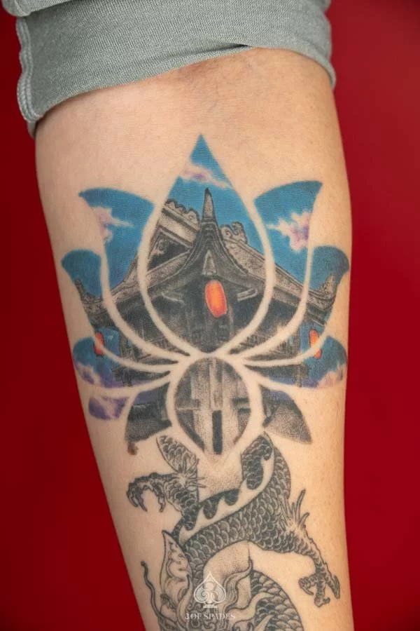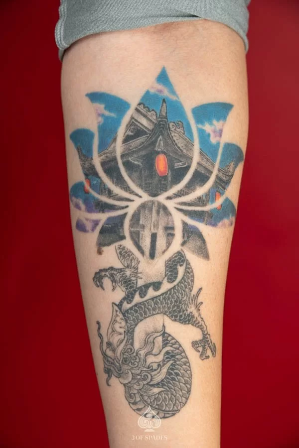 Absolutely. At 3 Of Spades Tattoo Hanoi, every tattoo starts as a custom design. We do not use generic flash art unless specifically requested. Your Colour Lotus One Pillar Pagoda Dragon tattoo will be a one-of-a-kind piece created specifically for you.