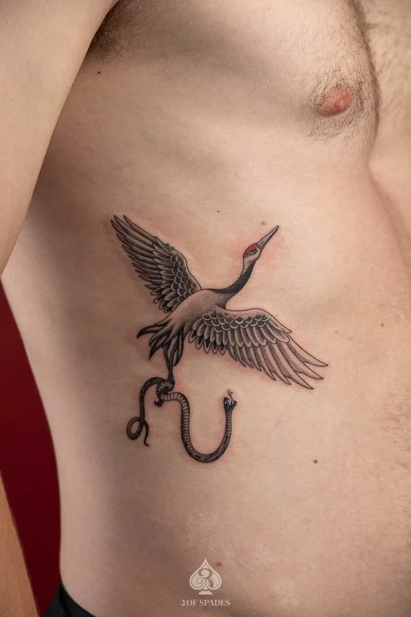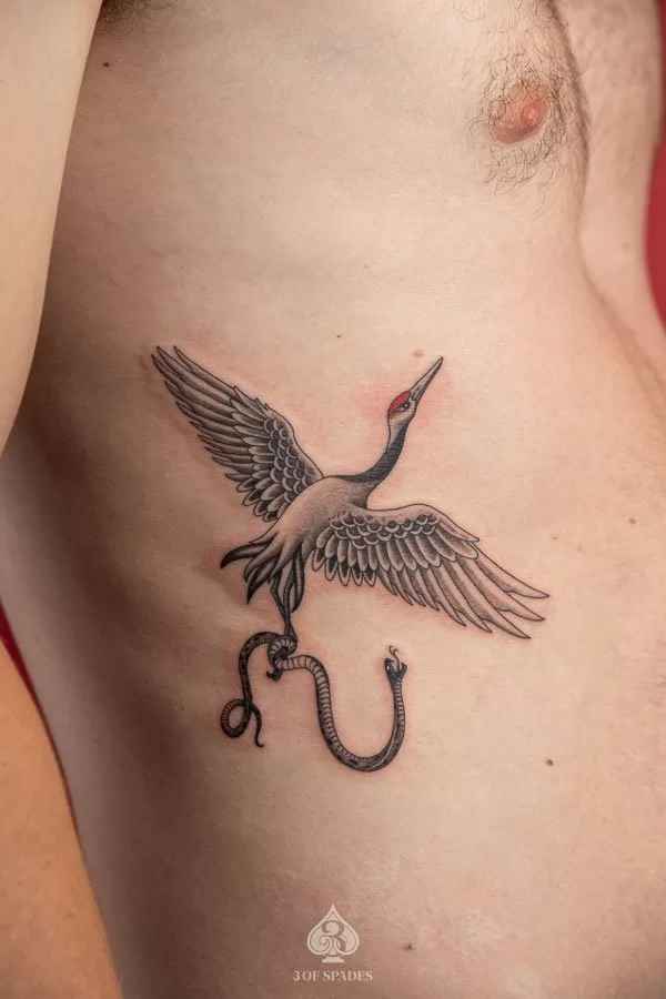 A Crane Snake Tattoo 2 tattoo represents a powerful connection between inner emotion and outward expression. The specific meaning can vary based on the design elements, style, and personal intention of the wearer. Our artists at 3 Of Spades Tattoo Hanoi can help you incorporate meaningful details into your unique design.