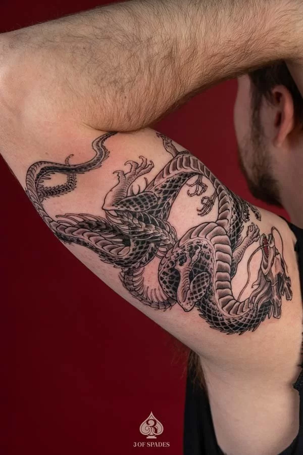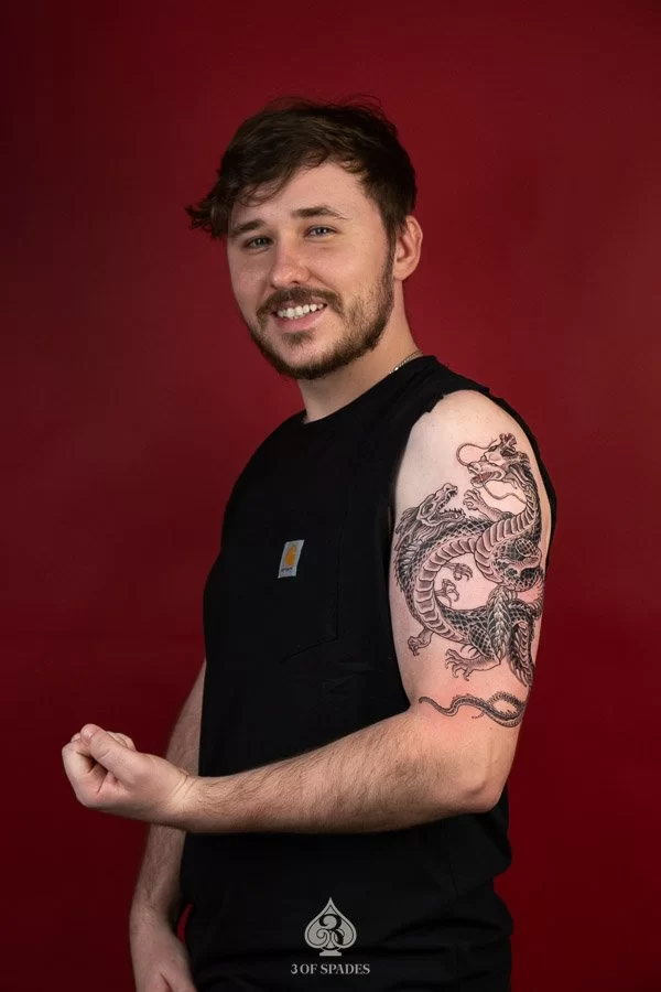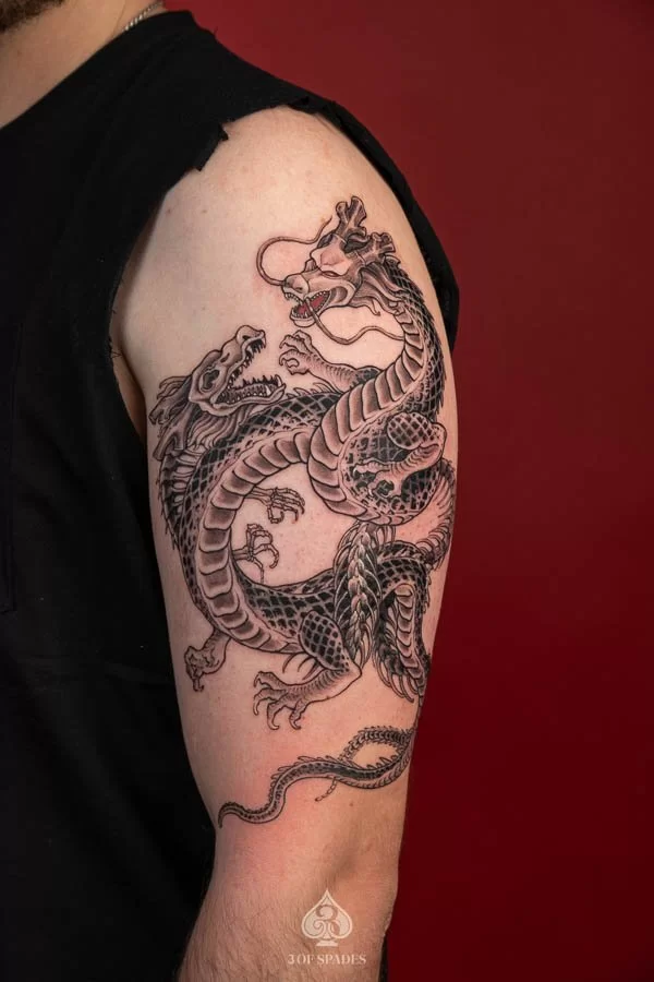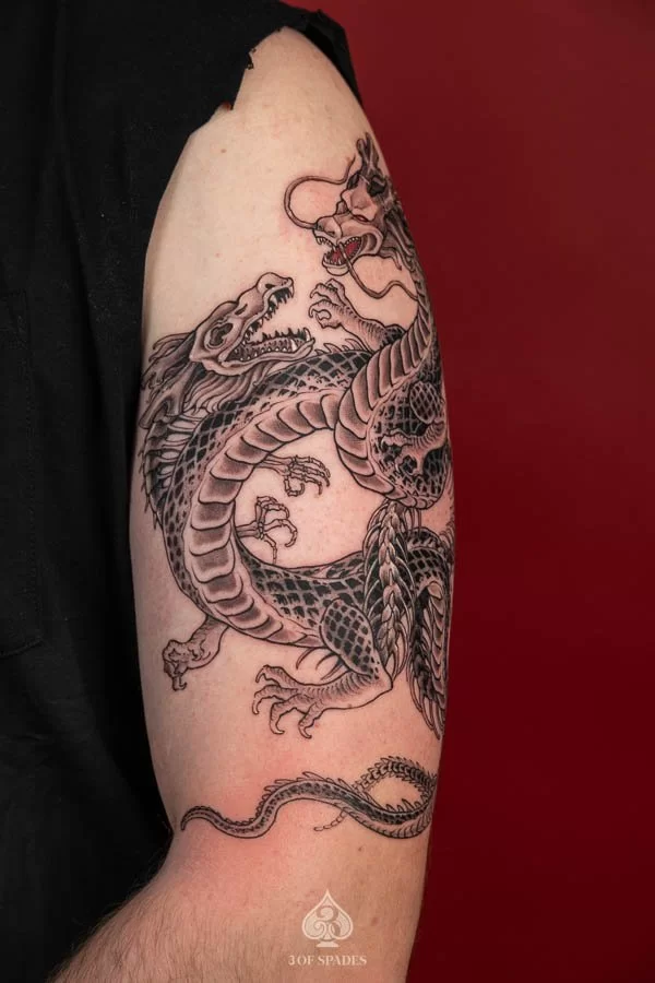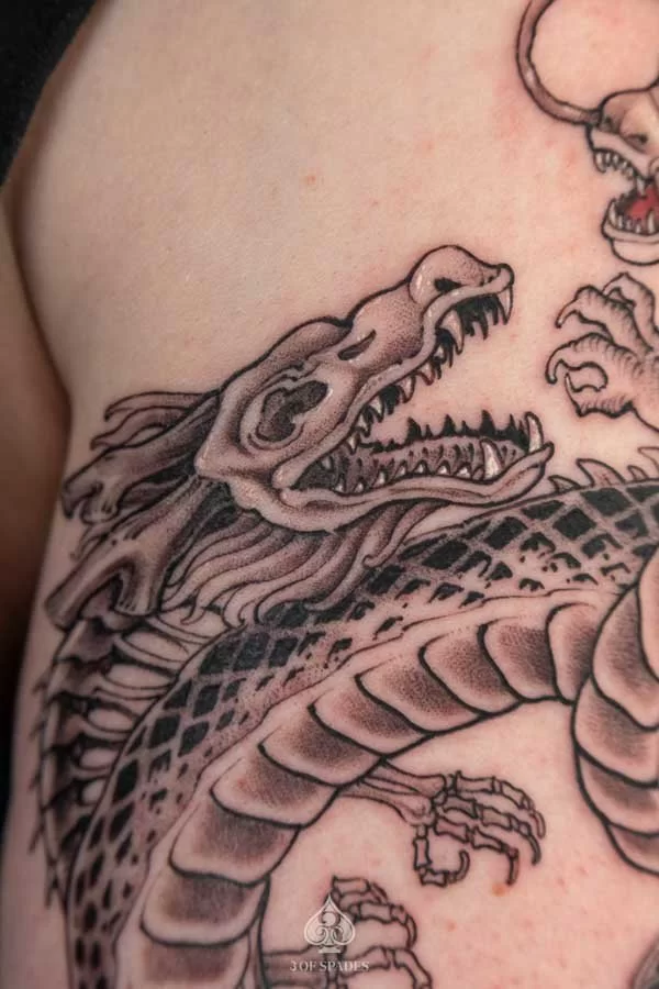 Most tattoos take 2 to 4 weeks for the surface to heal, with full skin recovery taking up to 3 months. We provide detailed aftercare instructions to ensure your 2 Dragonballz Skeleton Dragon Tattoo heals perfectly and retains its vibrancy.