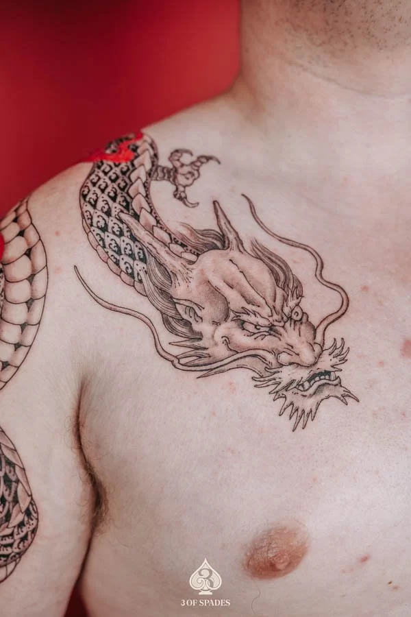 A Dragon Shoulder Tattoo tattoo holds cultural and spiritual meaning that transcends simple aesthetics. The specific meaning can vary based on the design elements, style, and personal intention of the wearer. Our artists at 3 Of Spades Tattoo Hanoi can help you incorporate meaningful details into your unique design.