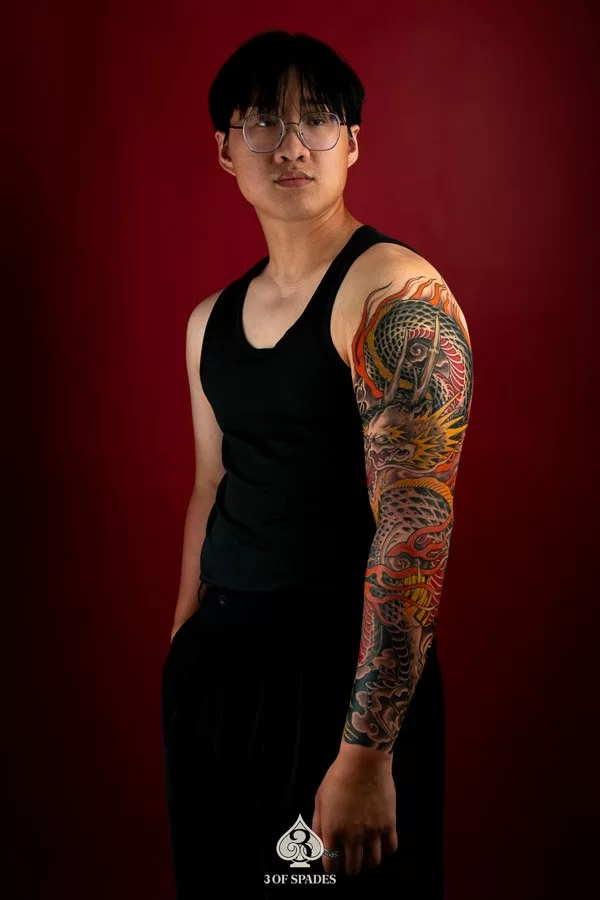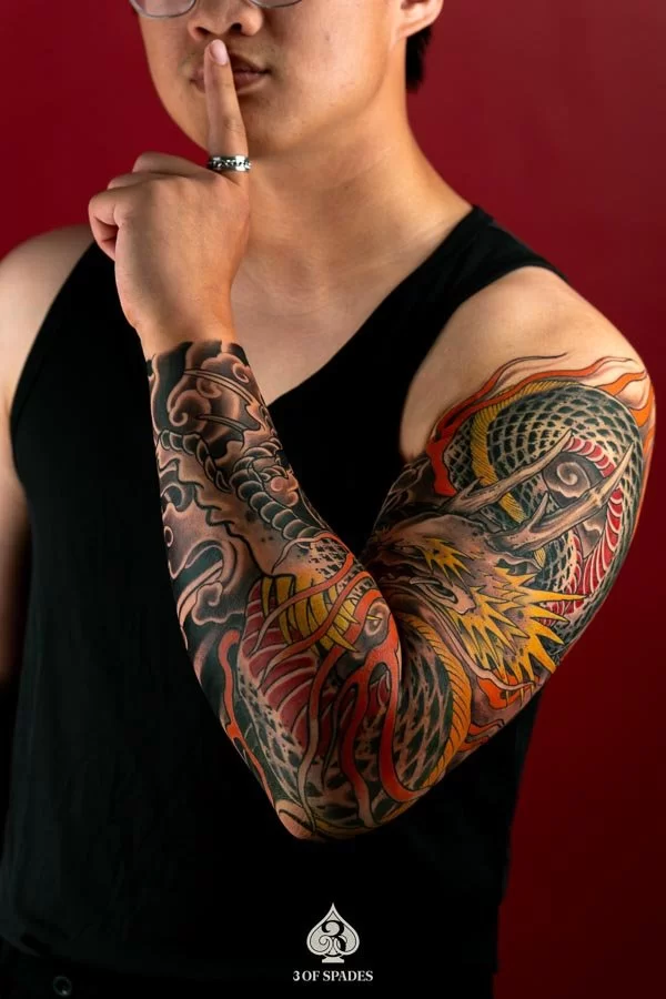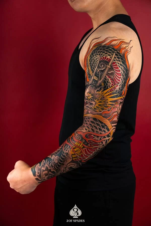 A Japanese Dragon Fullarm Tattoo tattoo holds cultural and spiritual meaning that transcends simple aesthetics. The specific meaning can vary based on the design elements, style, and personal intention of the wearer. Our artists at 3 Of Spades Tattoo Hanoi can help you incorporate meaningful details into your unique design.