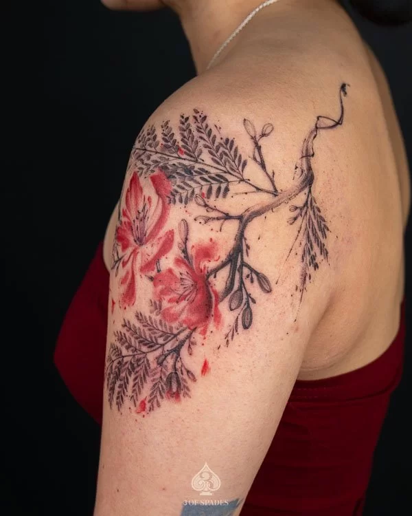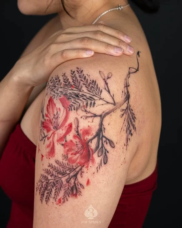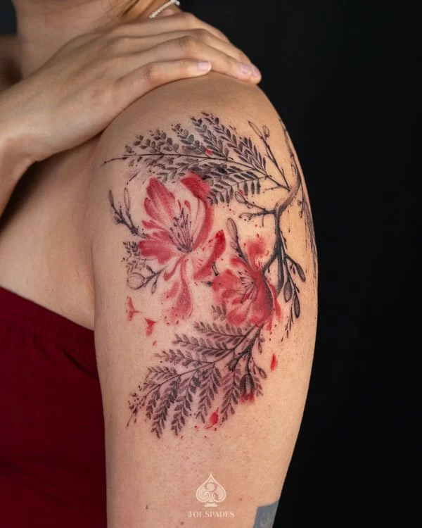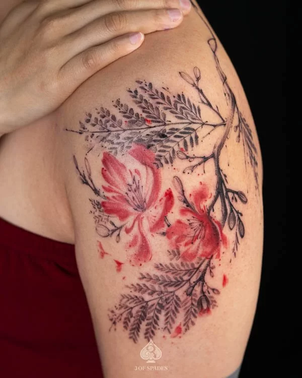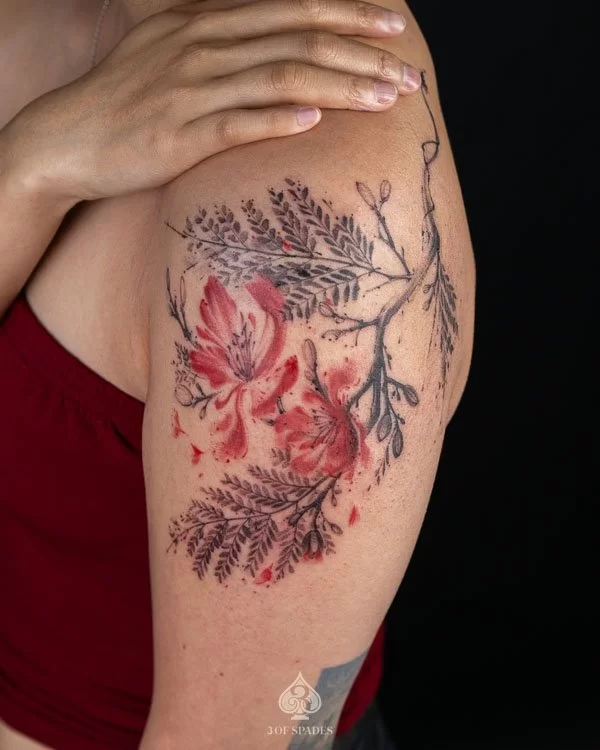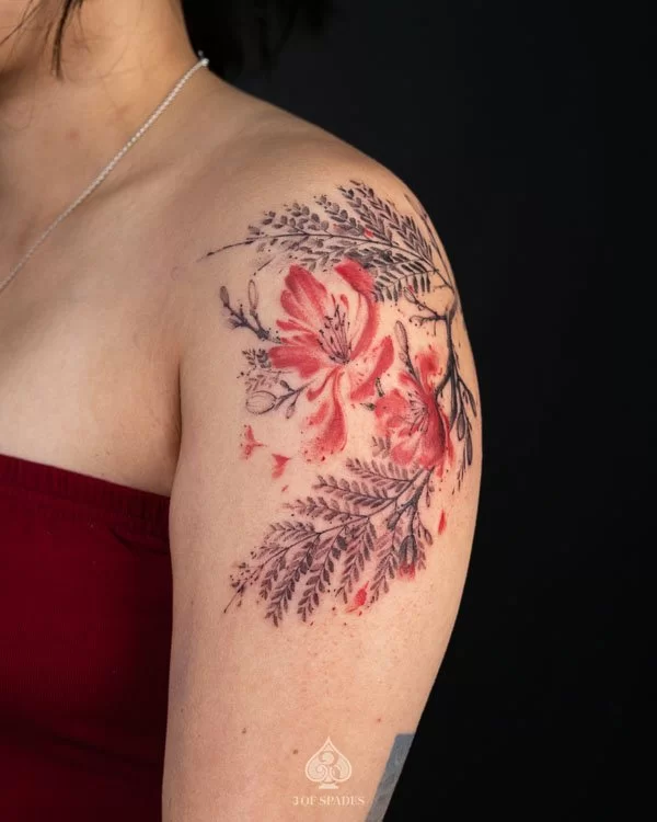 This interpretation brings a painterly quality to the Abstract Flower Fern Tattoo, blending artistic technique with tattoo craft. It creates a unique piece that feels both spontaneous and carefully considered.