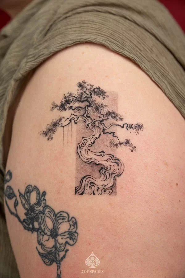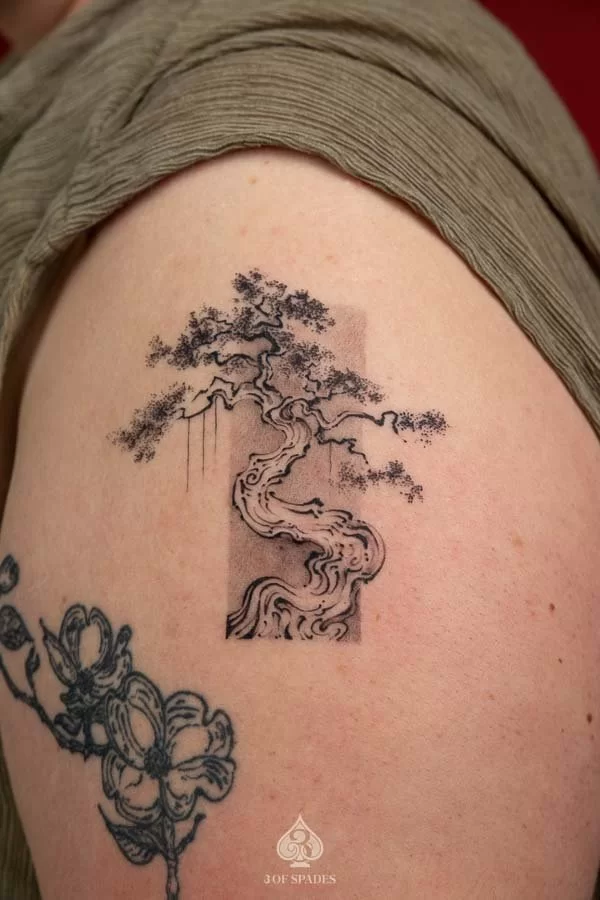 This interpretation brings a painterly quality to the Bonsai Tree Tattoo, blending artistic technique with tattoo craft. It creates a unique piece that feels both spontaneous and carefully considered.