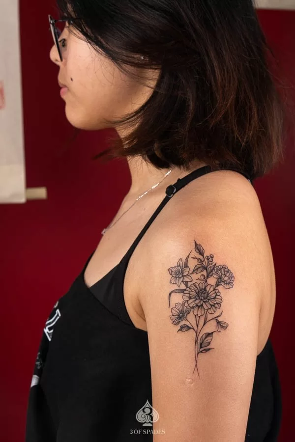 A Flower Bouquet Tattoo tattoo represents a powerful connection between inner emotion and outward expression. The specific meaning can vary based on the design elements, style, and personal intention of the wearer. Our artists at 3 Of Spades Tattoo Hanoi can help you incorporate meaningful details into your unique design.