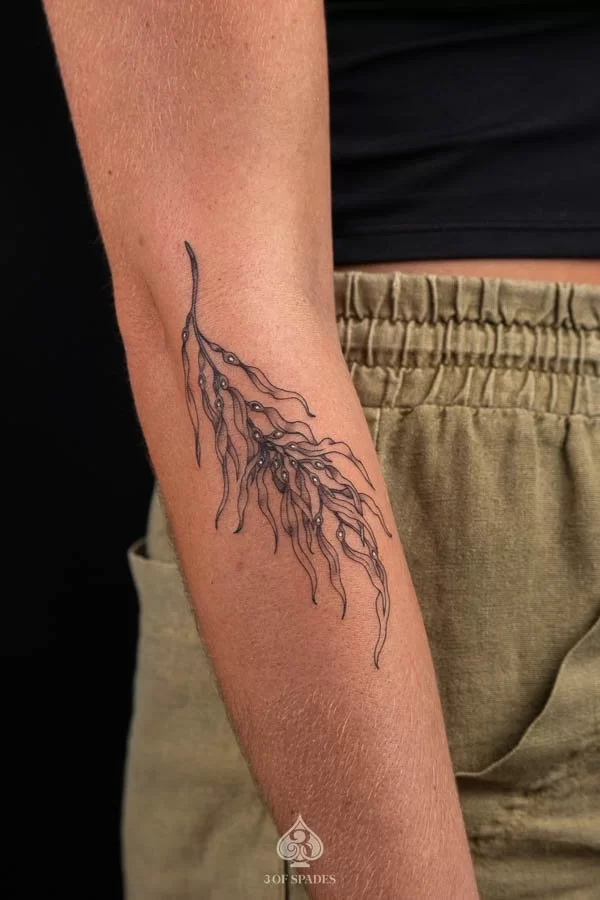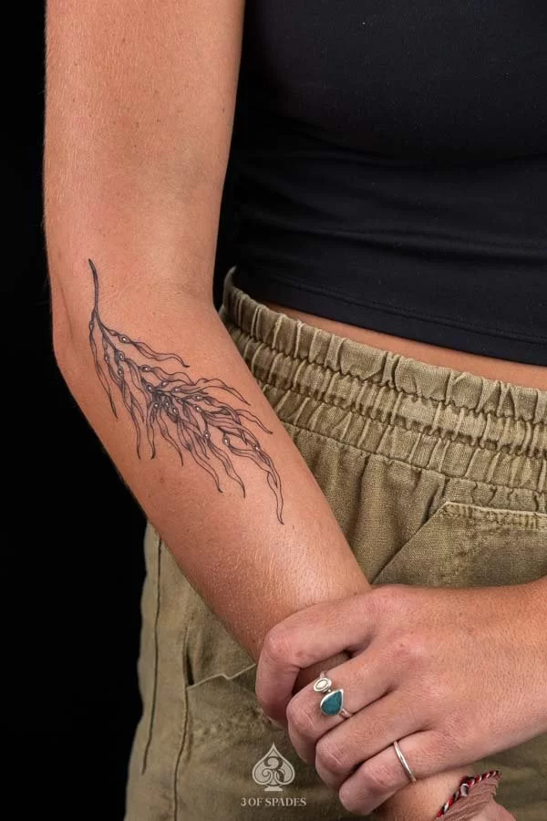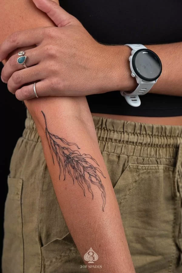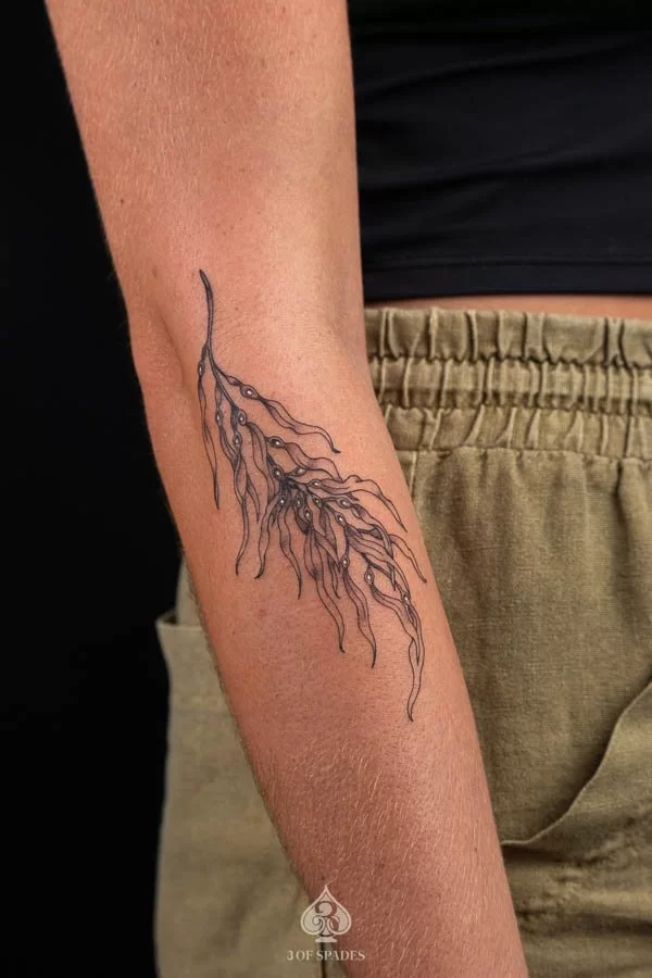This interpretation brings a painterly quality to the Kelp Branch Tattoo, blending artistic technique with tattoo craft. It creates a unique piece that feels both spontaneous and carefully considered.