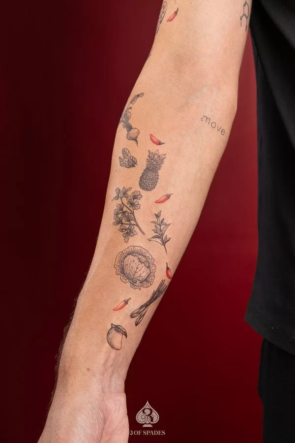 A Mini Food Ingredient tattoo holds cultural and spiritual meaning that transcends simple aesthetics. The specific meaning can vary based on the design elements, style, and personal intention of the wearer. Our artists at 3 Of Spades Tattoo Hanoi can help you incorporate meaningful details into your unique design.