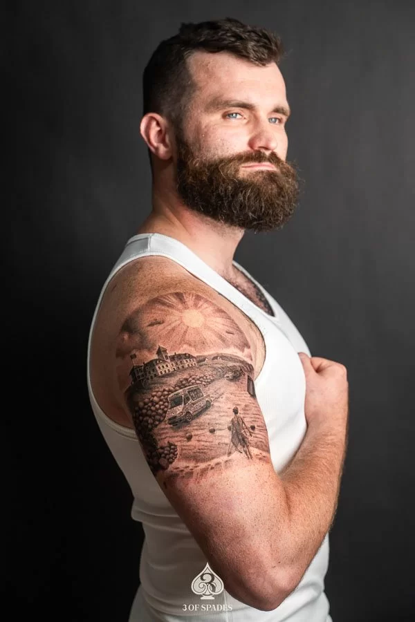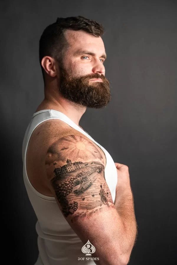 Most tattoos take 2 to 4 weeks for the surface to heal, with full skin recovery taking up to 3 months. We provide detailed aftercare instructions to ensure your Realism Beach Landscape Tattoo heals perfectly and retains its vibrancy.