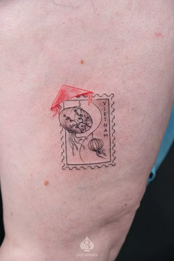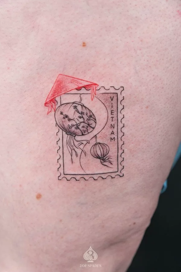 Absolutely. At 3 Of Spades Tattoo Hanoi, every tattoo starts as a custom design. We do not use generic flash art unless specifically requested. Your Red Conical Hat Stamp tattoo will be a one-of-a-kind piece created specifically for you.