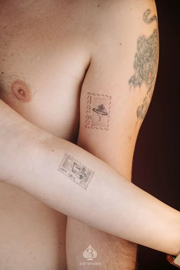 Your Vietnam Inspired Stamps Tattoo journey starts with a conversation. Whether you have a clear vision or just the beginning of an idea, our artists at 3 Of Spades Tattoo Hanoi are ready to collaborate with you. We believe that Body is my journal, tattoos are my stories, and we are here to help you write your next chapter.