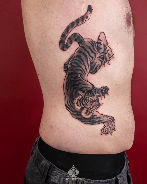 Most tattoos take 2 to 4 weeks for the surface to heal, with full skin recovery taking up to 3 months. We provide detailed aftercare instructions to ensure your Tiger Blackwork Ribb Tattoo heals perfectly and retains its vibrancy.
