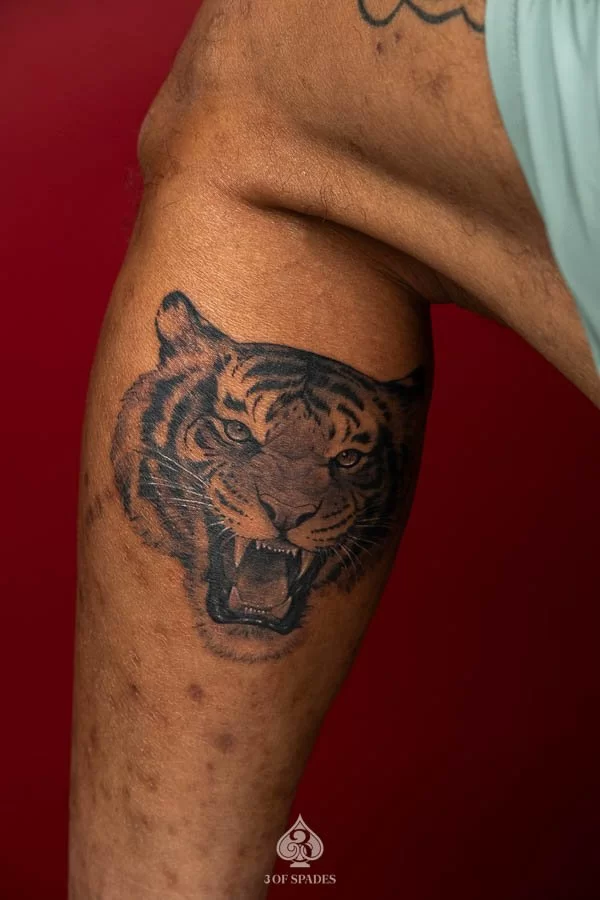 Most tattoos take 2 to 4 weeks for the surface to heal, with full skin recovery taking up to 3 months. We provide detailed aftercare instructions to ensure your Tiger Realism Thigh Tattoo heals perfectly and retains its vibrancy.
