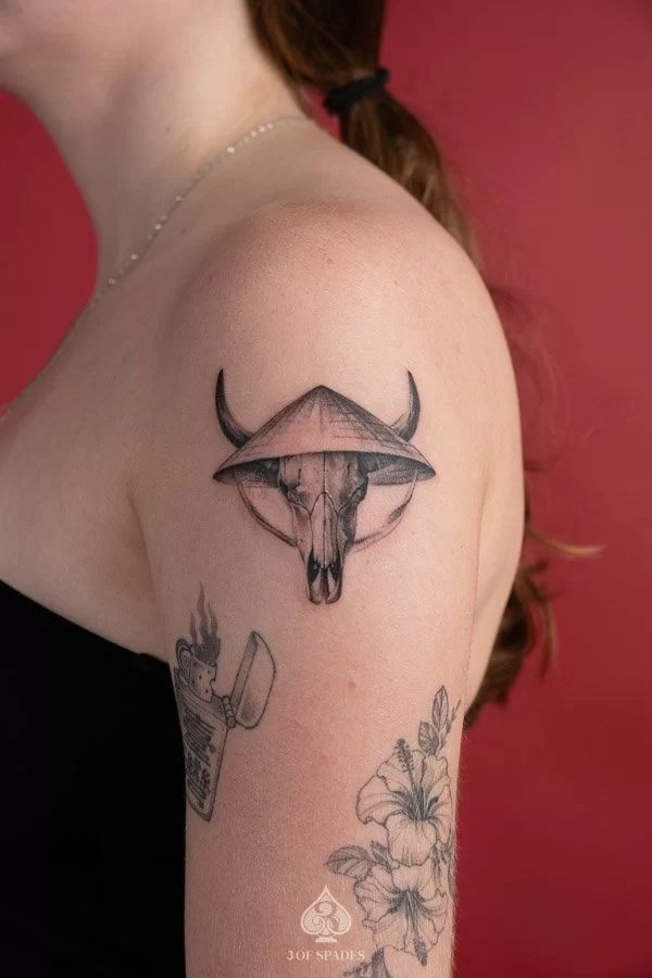 A Buffalo Conical Hat tattoo carries deep personal significance for many who choose it. The specific meaning can vary based on the design elements, style, and personal intention of the wearer. Our artists at 3 Of Spades Tattoo Hanoi can help you incorporate meaningful details into your unique design.