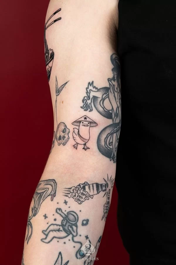 Most tattoos take 2 to 4 weeks for the surface to heal, with full skin recovery taking up to 3 months. We provide detailed aftercare instructions to ensure your Pho And Silly Duck Tattoo heals perfectly and retains its vibrancy.