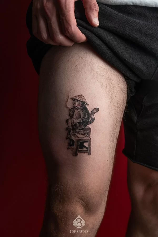 A Vietnamese Cat Smoking tattoo embodies a story that words alone cannot capture. The specific meaning can vary based on the design elements, style, and personal intention of the wearer. Our artists at 3 Of Spades Tattoo Hanoi can help you incorporate meaningful details into your unique design.