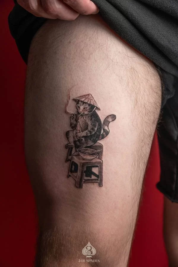 The Vietnamese Cat Smoking Tattoo is one of those designs that speaks before you do. At 3 Of Spades Tattoo Hanoi, we have had the privilege of bringing countless Vietnamese Cat Smoking designs to life for clients from around the world. Whether you discovered this design while traveling through Hanoi or have been dreaming about it for years, a Vietnamese Cat Smoking Tattoo at our studio is more than ink on skin. It is a statement, a memory, a piece of who you are. As we say: Body is my journal, tattoos are my stories.