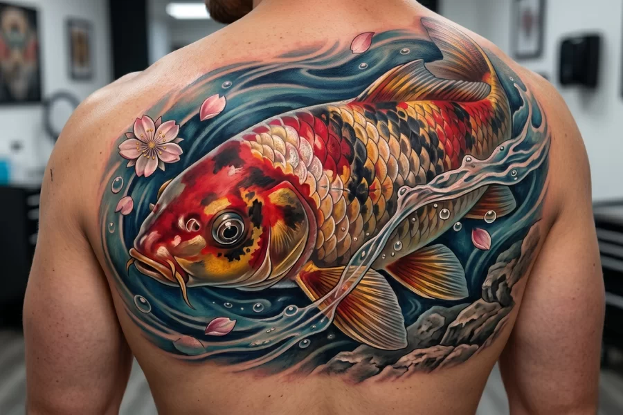 A realism koi fish tattoo focuses on lifelike detail. From the texture of the scales to the movement of water, this style aims to recreate the fish as it appears in nature. It requires technical skill but results in a very striking piece.
